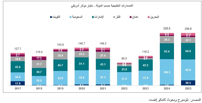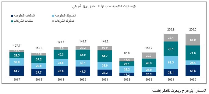 بلغت إصدارات الحكومات 77.9 مليار دولار في عام 2025، مقابل 98.6 مليار دولار في عام 2024، بينما ارتفعت إصدارات الشركات إلى 128.6 مليار دولار، مقارنة بمستواها في العام السابق البالغ 108.2 مليار دولار.
