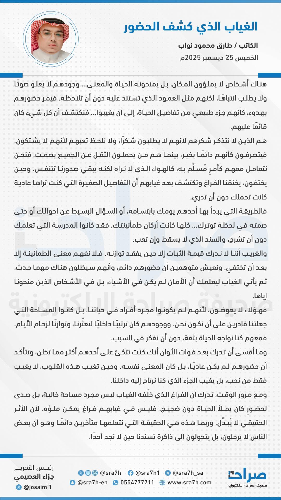 ومع مرور الوقت، تدرك أن الفراغ الذي خلّفه الغياب ليس مجرد مساحة خالية، بل صدى لحضورٍ كان يملأ الحياة دون ضجيج. فليس في غيابهم فراغ يمكن ملؤه، لأن الأثر الحقيقي لا يُبدَّل. وربما هذه هي الحقيقة التي نتعلمها متأخرين دائمًا وهو أن بعض الناس لا يرحلون، بل يتحولون إلى ذاكرة تسندنا حين لا نجد أحدًا.