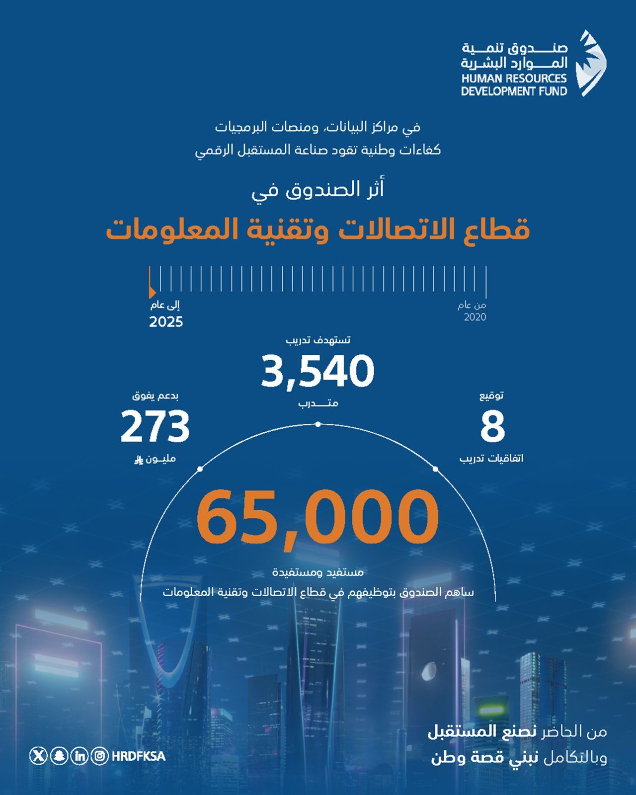 تعزيزًا لجهود صندوق تنمية الموارد البشرية في تمكين قطاع الاتصالات وتقنية المعلومات باعتباره أحد الركائز الأساسية لتحقيق مستهدفات رؤية المملكة 2030، في بناء مجتمع رقمي، وحكومة رقمية، واقتصاد رقمي مزدهر، ومستقبل مبتكر للمملكة، كشف الصندوق عن مساهمته في توظيف 65 ألف مواطن ومواطنة في قطاع الاتصالات وتقنية المعلومات، خلال الفترة من عام 2020 وحتى النصف الأول عام 2025م.