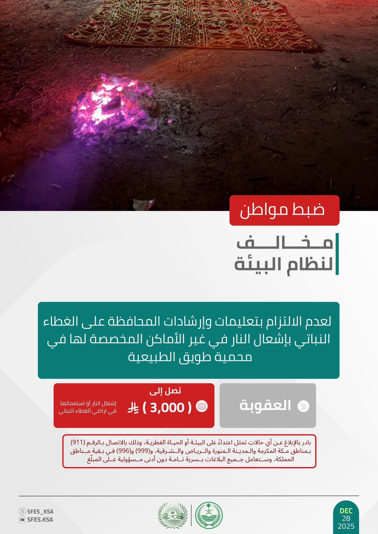 وأكدت القوات أن عقوبة إشعال النار في غير الأماكن المخصصة لها في الغابات والمتنزهات الوطنية غرامة تصل إلى (3,000) ريال، حاثة على الإبلاغ عن أي حالات تمثل اعتداءً على البيئة أو الحياة الفطرية على الرقم (911) بمناطق مكة المكرمة والمدينة المنورة والرياض والشرقية، و (999) و (996) في بقية مناطق المملكة، وستعامل جميع البلاغات بسرية تامة دون أدنى مسؤولية على المبلّغ.