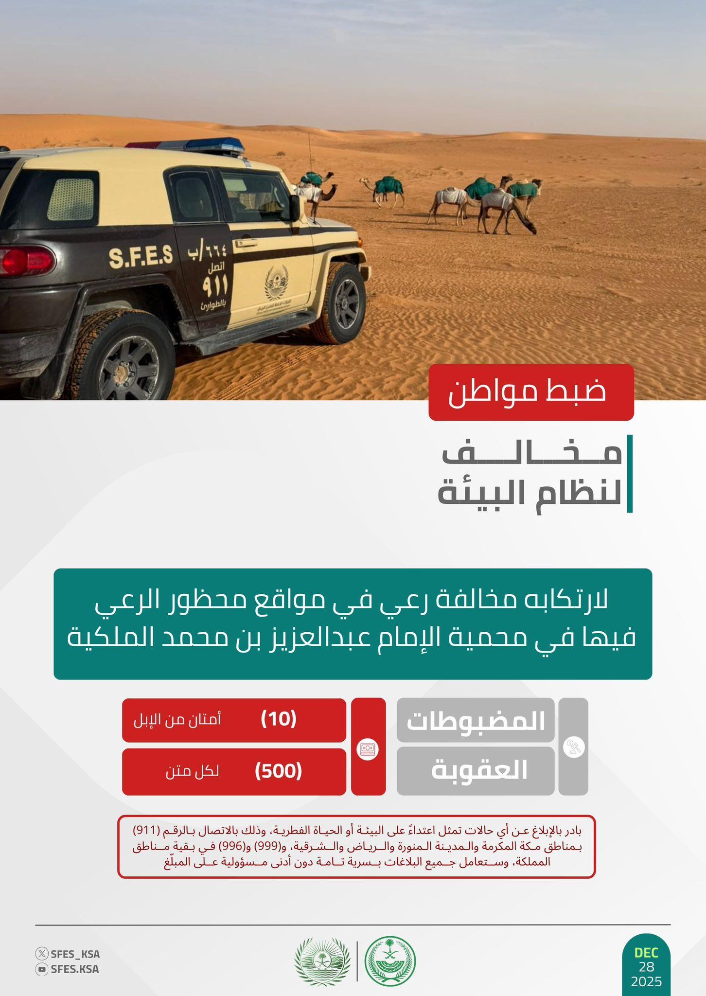 وأكدت القوات أن عقوبة رعي الإبل غرامة (500) ريال لكل متن، حاثةً على الإبلاغ عن أي حالات تمثل اعتداءً على البيئة أو الحياة الفطرية على الرقم (911) بمناطق مكة المكرمة والمدينة المنورة والرياض والشرقية، و(999) و(996) في بقية مناطق المملكة، وستعامل جميع البلاغات بسرية تامة دون أدنى مسؤولية على المبلّغ.