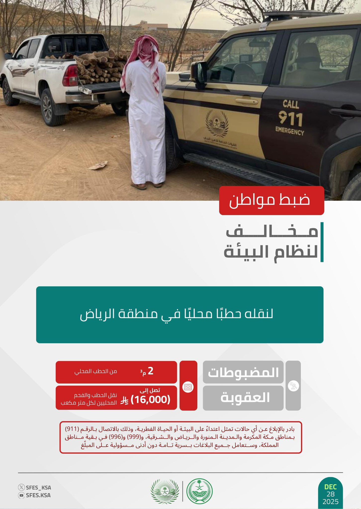 وأوضحت القوات أن عقوبة نقل الحطب والفحم المحليين تصل إلى (16,000) ريال لكل متر مكعب، حاثةً على الإبلاغ عن أي حالات تمثل اعتداءً على البيئة أو الحياة الفطرية على الرقم (911) بمناطق مكة المكرمة والمدينة المنورة والرياض والشرقية، و(999) و(996) في بقية مناطق المملكة، وستعامل جميع البلاغات بسرية تامة دون أدنى مسؤولية على المبلّغ.