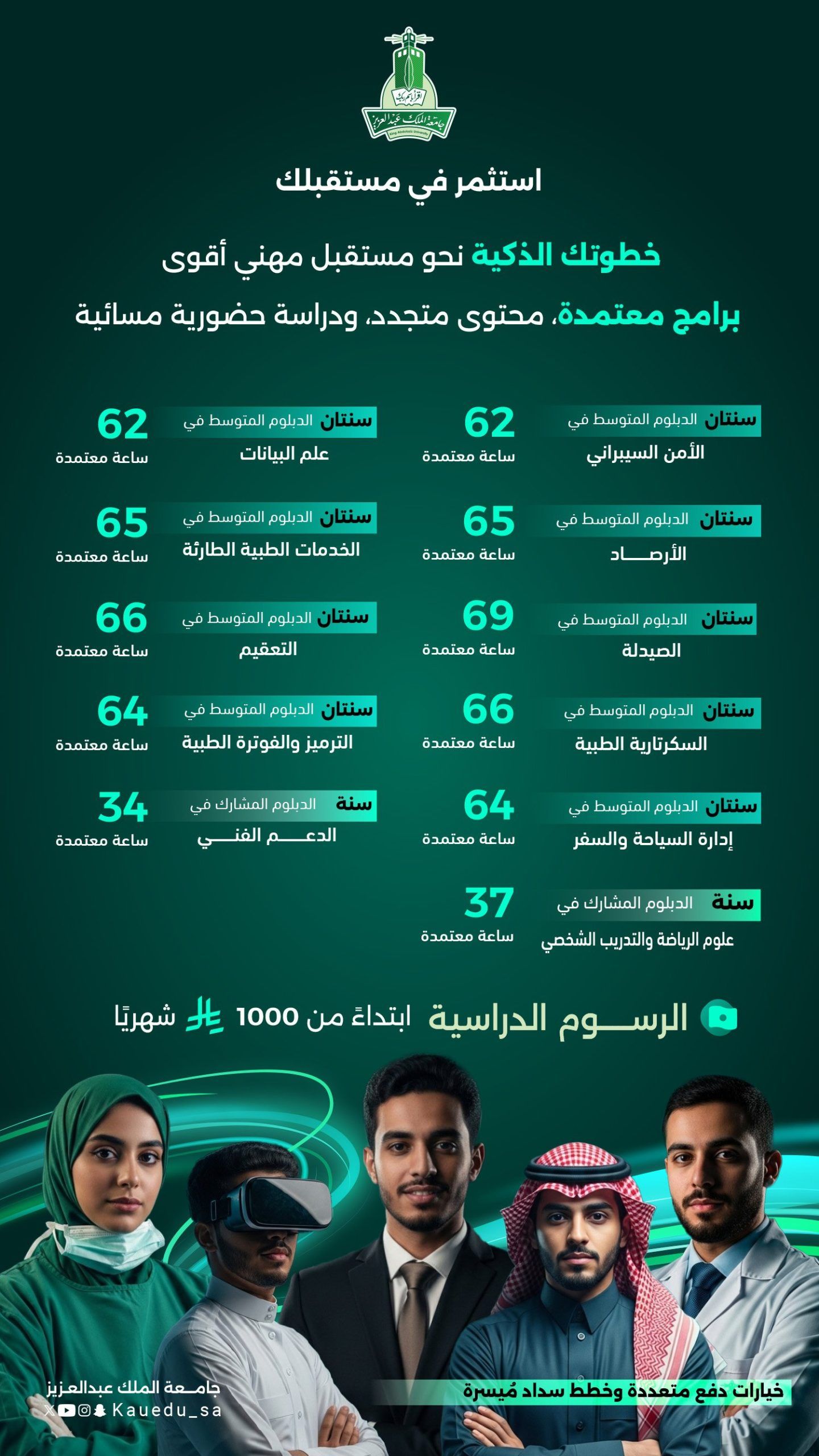 كما ضمت القائمة برامج الدبلوم المشارك (سنة واحدة) في تخصصي الدعم الفني، وعلوم الرياضة والتدريب الشخصي، وتتميز هذه البرامج برسوم دراسية تبدأ من 1000 ريال شهرياً، مع توفر خيارات دفع متعددة وخطط سداد ميسرة للطلاب والطالبات.