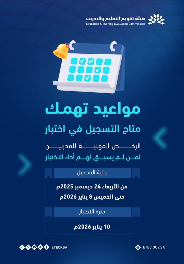 وأشارت الهيئة إلى أن موعد انعقاد الاختبار سيكون يوم السبت 10 يناير 2026م، مؤكدة أهمية الالتزام بالمواعيد المحددة لضمان دخول الاختبار في موعده المقرر.