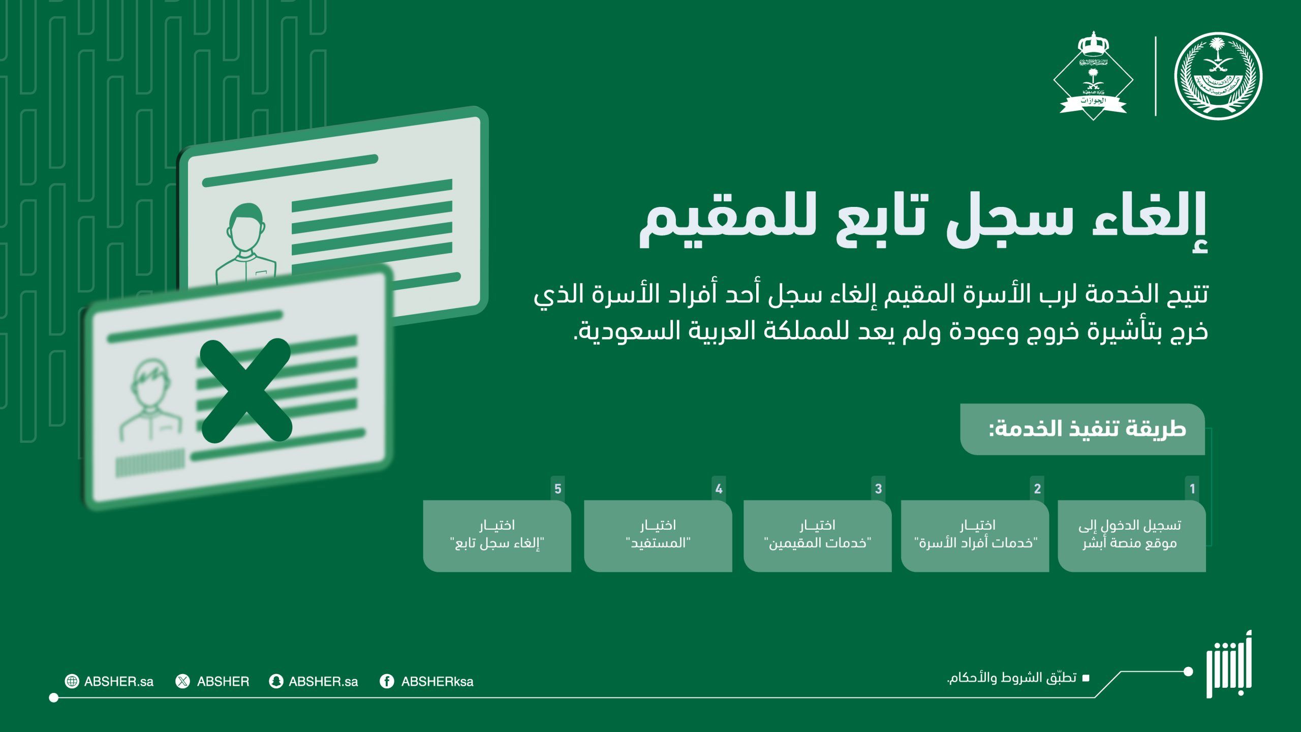 وأوضحت المنصة أن الخدمة تُمكّن رب الأسرة المقيم من إلغاء سجل أحد أفراد أسرته الذي لم يعد إلى المملكة بعد انتهاء مدة تأشيرة الخروج والعودة، وذلك بشكل مباشر عبر المنصة دون الحاجة إلى مراجعة الجهات المختصة.
